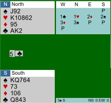CONTRATTO DI 3 PICCHE DI OVEST ATTACCA 5 FIORI PRESE CERTE 3 Fiori 4 Picche (se 3/2) MANCANO 2 prese DOVE TROVARLE? Perdenti certe 2 quadri 2 cuori ipotesi: picche 3/2 con asso in OVEST e 10 in EST Provare l'expass al J di picche giocando piccola da sud e anche piccola cuori per il K e poi 2 di picche per il K Se non cade l'asso giocare fiori per il 9 di taglio di NORD cedere le QUADRI perdenti