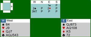CONTRATTO 3 SENZA DI OVEST ATTACCA NORD 10 QUADRI PRESE CERTE: 1 cuori 1 fiori e altre 5 o 4 se K in Nord) 2 a quadri PERDENTI CERTE: 2 se attaccano a picche, 1 a quadri Questo contratto e' infattibile se il K di cuori e' in SUD e il K di fiori in nord STRATEGIA DI GIOCO: si deve sperare che il K di fiori sia terzo in SUD e il K di cuori a Nord Pertando e' necessario giocare due volte le fiori da EST tentando l'impass alle cuori Sul 10 di quadria EST non conviene giocare il K ma il 5 Se SUD liscia (L'asso puo' sempre farlo...) OVEST prende e gioca J di cuori Nord che vede il morto non mette il K ma est deve prendere con la Q dal suo lato per tentare l'impass a fiori, giocando una delle 2 fiori Se l'impass riesce torna al morto con la cuori per il 10 poi gioca l'asso di cuori sul quale scarte una picche e infine l'ultima fiori sul quale cade l'asso. Questa la smazzata:LINK X GIOCARE: https://tinyurl.bridgebase.com/3kvzmp6n