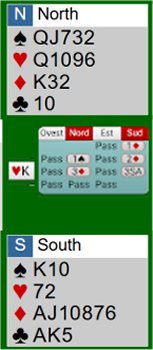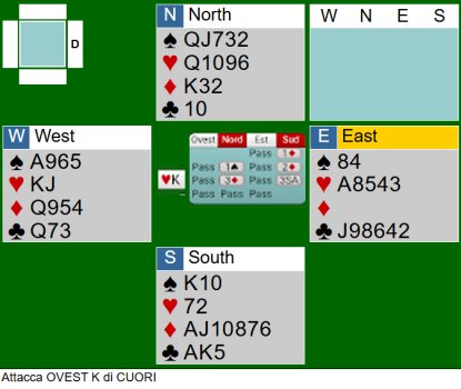 CONTRATTO 3 SENZA - ATTACCA OVEST K CUORI PRESE CERTE: 2 FIORI 2 QUADRI PRESE POSSIBILI 4 a quadri 2 cuori (10 e 9) 3 a picche COME COMINCIARE ? L'attacco di K di ovest fa pensare che abbia anche l'ASSO e il Jack sia in EST L'obiettivo primario e' tentare di affrancare le QUADRI ipotizzando una divisione 3 /1 con la donna terza Nel caso si vada in presa, conviene pero' tentare L'impass giocando piccola dal morto o l'expass di 10 e J verso il K di nord? la regola dice di provare prima l'expass e tenere pero' i rientri in SUD e non giocare fiori Nel caso OVEST giochi fiori, bisogna lisciare Molto dipende dal gioco di EST /OVEST